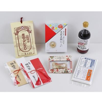 ふっくらとした「天然真鯛おこわ」と「めで鯛茶漬け」、体を温める「生姜糖」、香り豊かな「煎茶」と「紅茶」、甘さが広がる「出雲ぜんざい」、そして風味豊かな「鯛の白だし」。
