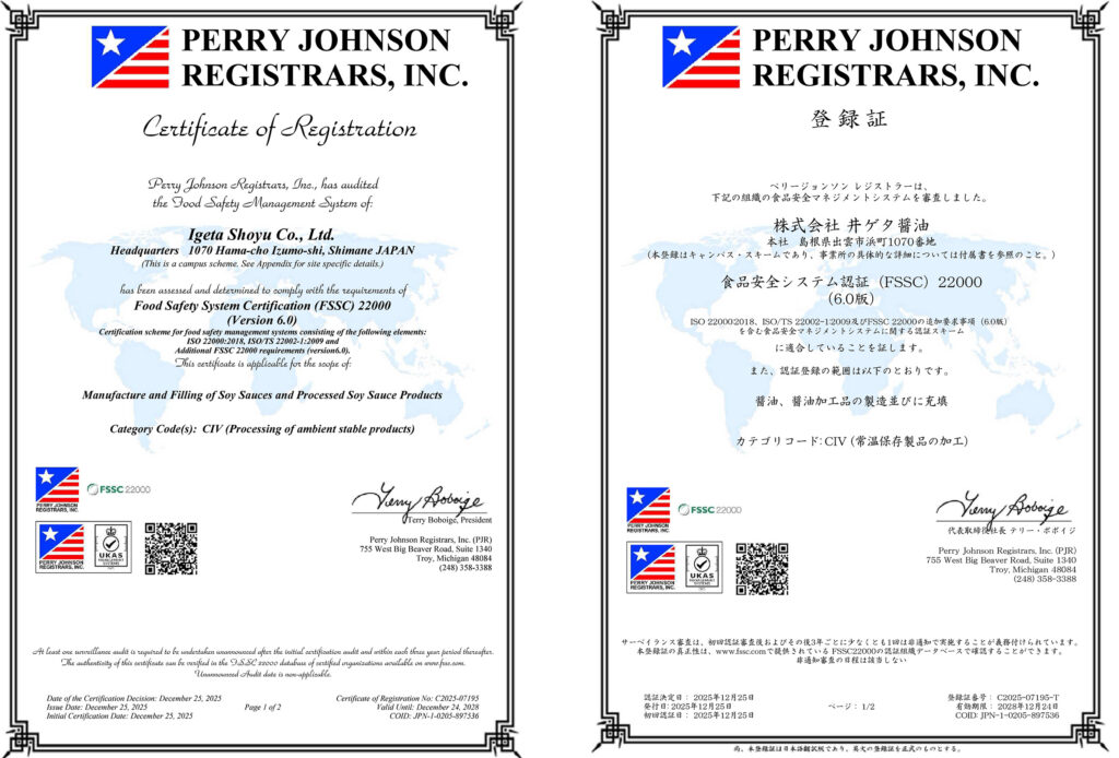 この度、株式会社井ゲタ醤油は食品安全マネジメントシステムに関する国際規格である「FSSC22000」の認証を取得いたしました。